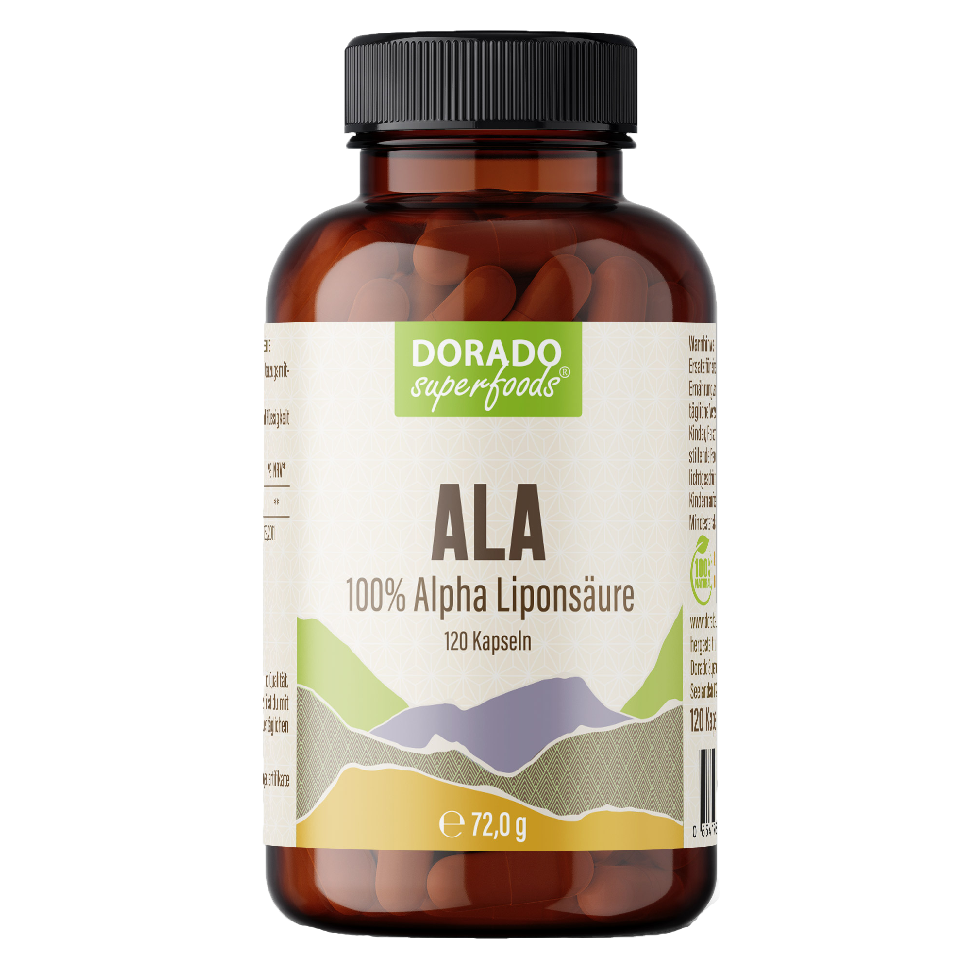 Entdecke unsere ALA – Alpha-Liponsäure Kapseln: Jede Kapsel enthält 500 mg hochdosierte Alpha-Liponsäure in einer veganen HPMC-Kapselhülle. Mit 120 Kapseln pro Packung reicht der Vorrat für 4 Monate bei täglicher Einnahme. Unsere Kapseln sind frei von unnötigen Zusatzstoffen und werden in Deutschland unter strengen Qualitätsstandards hergestellt. Verpackt in lichtgeschützten Dosen, bleiben Inhaltsstoffe optimal geschützt.