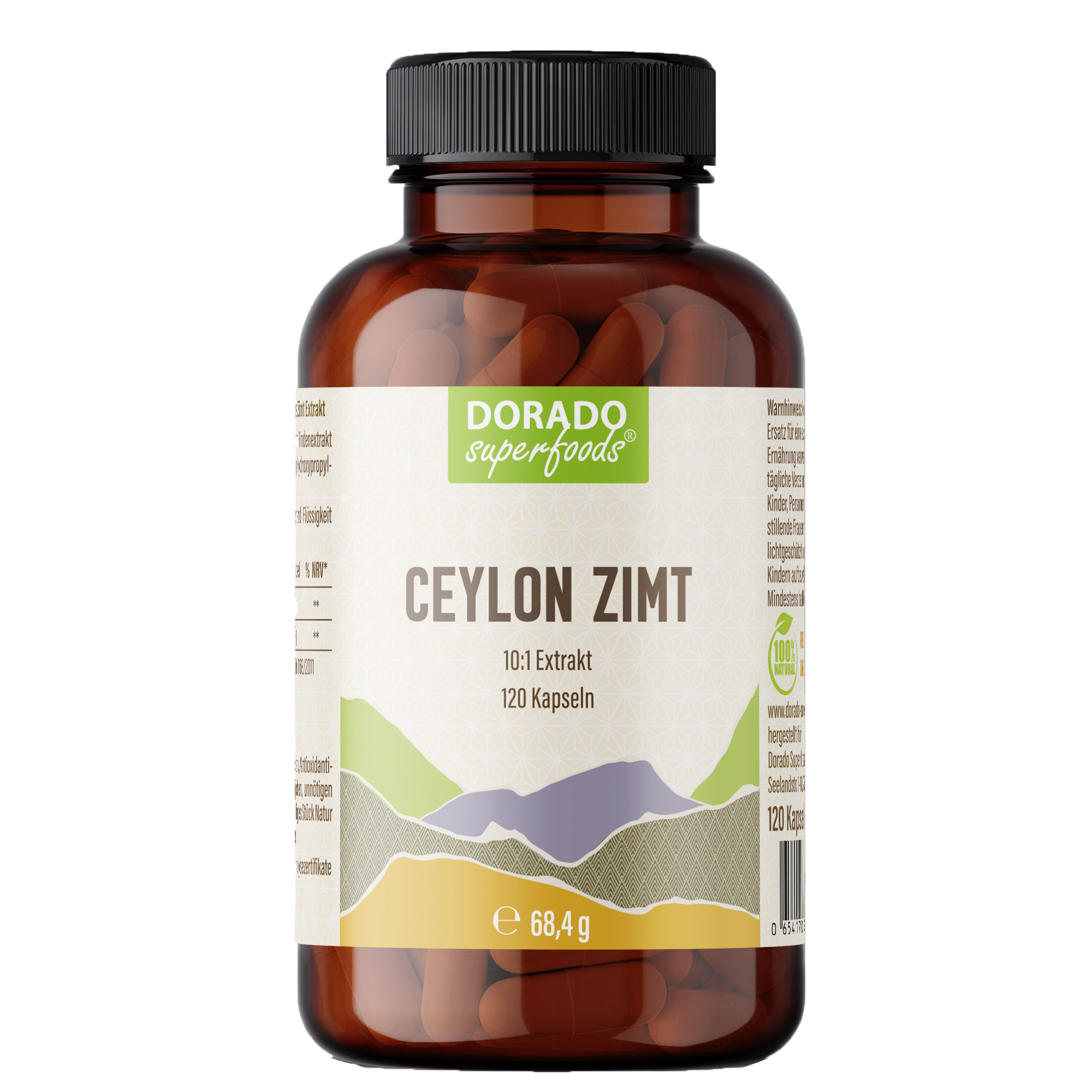 Zutaten pro Kapsel: 500 mg Cinnamomum zeylanicum Rindenextrakt (enthält 10% Polyphenole ), 100 mg Hydroxypropylmethylcellulose ( Kapselhülle )