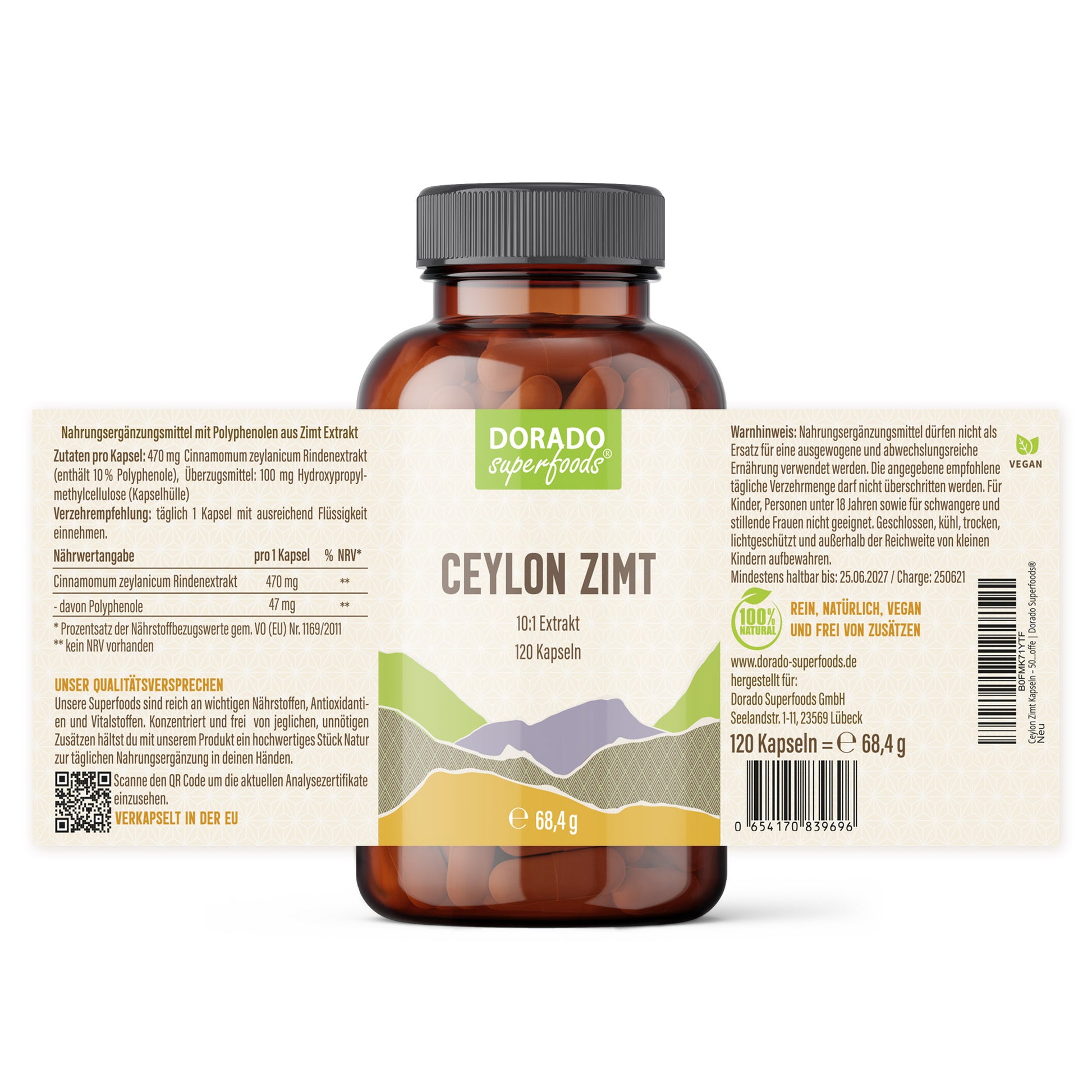 Warnhinweis: Nahrungsergänzungsmittel sind weder ein Ersatz für eine gesunde Lebensweise noch für die Verwendung als einzige Nahrungsquelle geeignet. Außerhalb der Reichweite von kleinen Kindern aufbewahren. Die angegebene tägliche Verzehrmenge nicht überschreiten.